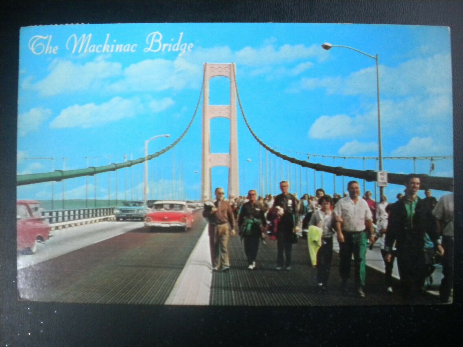 Title (ebay affiliate link): VINTAGE POSTCARD VIEW OF THE MACKINAC BRIDGE, MI, 1965, W/OLD AUTOS