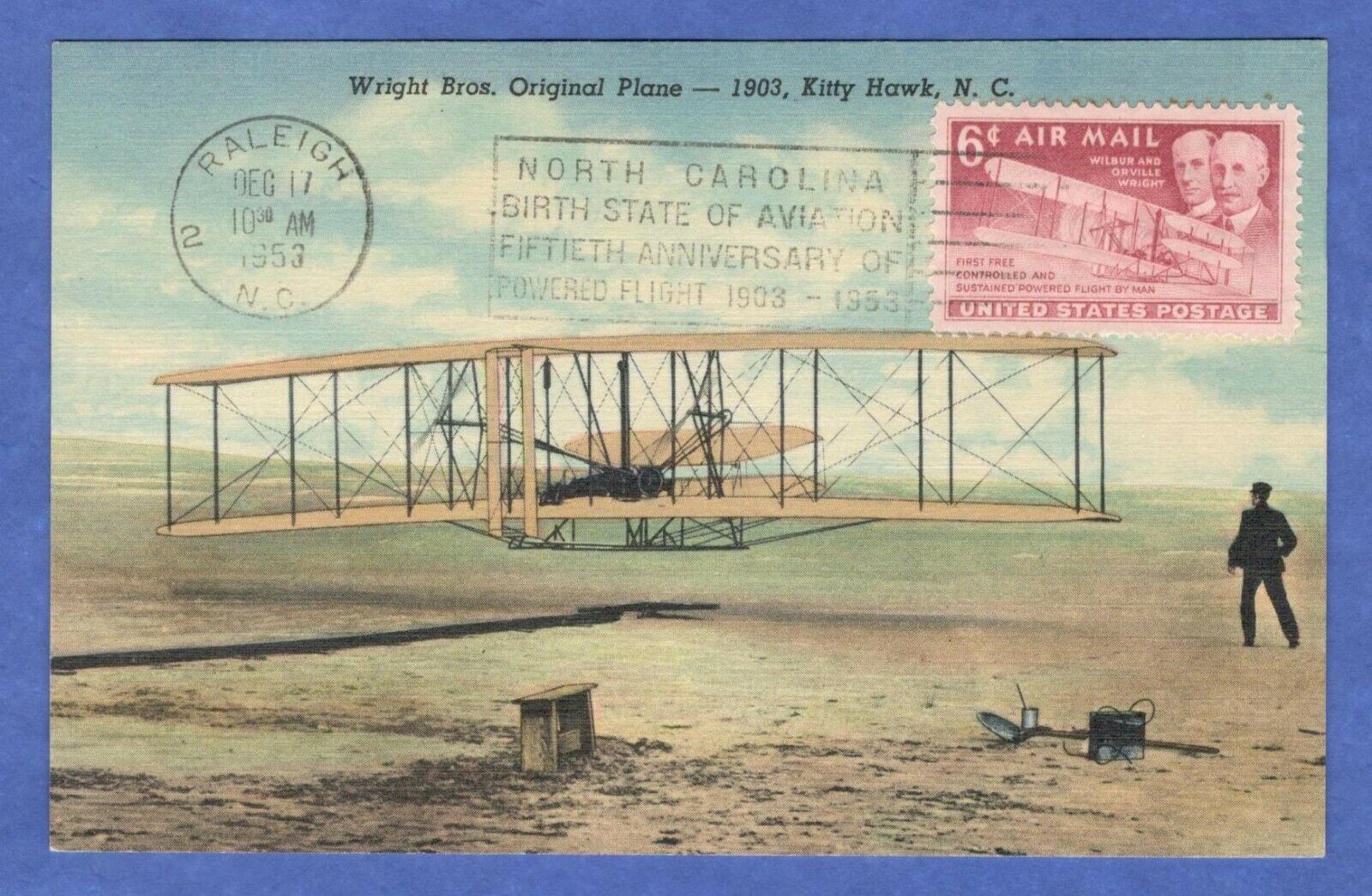 Wright Bros, Original Plane, Kitty Hawk NC, Linen Maximum Postcard 1953