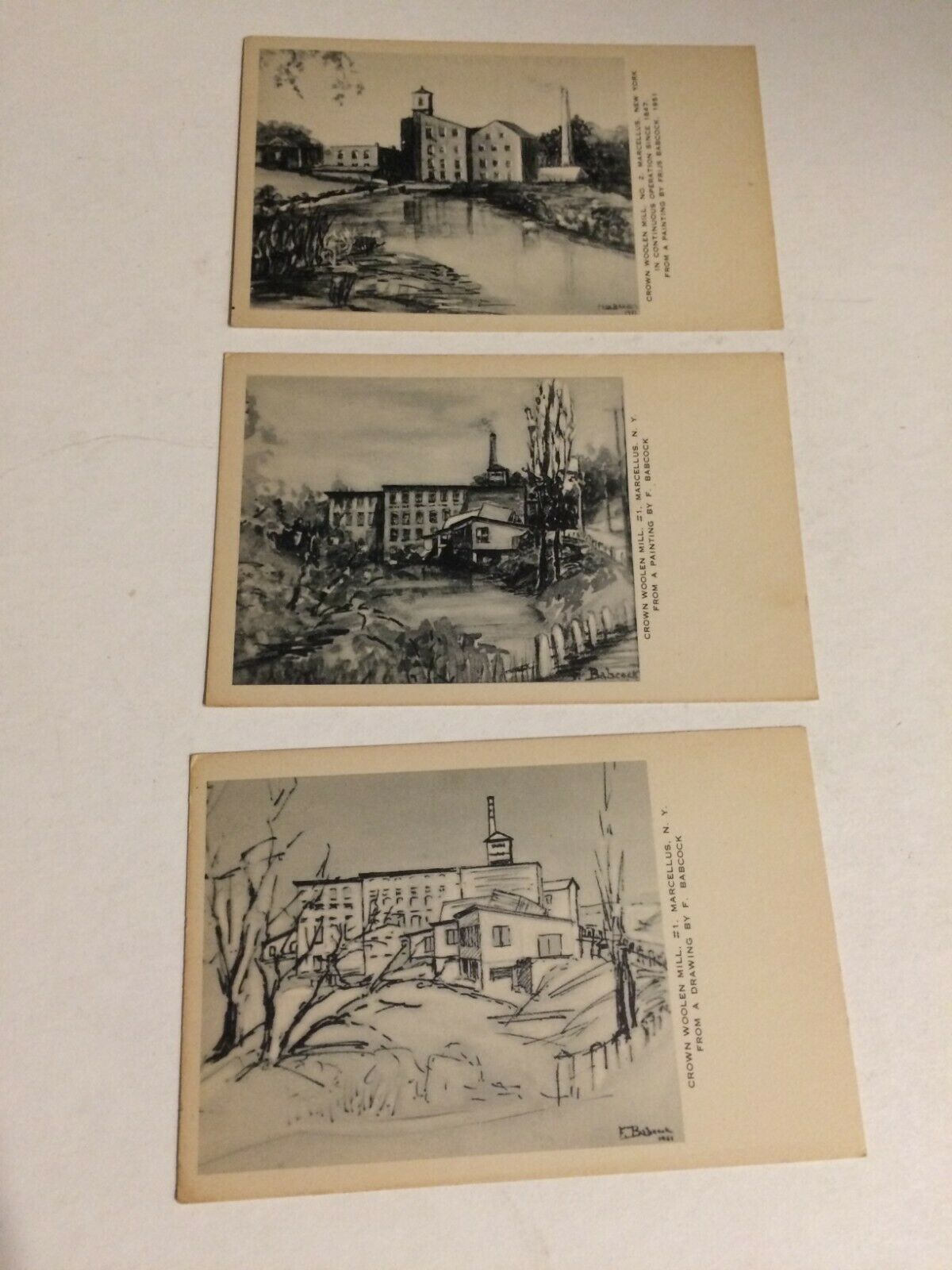Lot of 3 Vintage Postcards, Crown Woolen Mill, Marcellus NY, Artist F. Babcock