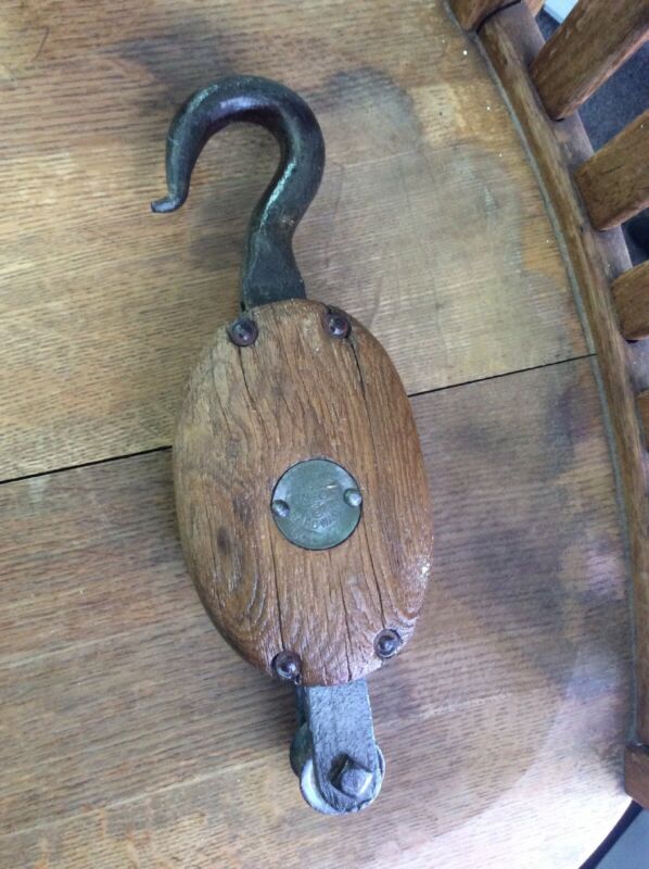 Title (ebay affiliate link): Antique Union Hardware Co Pulleys Iron and Wood Vintage Farm Barn Block Tackle