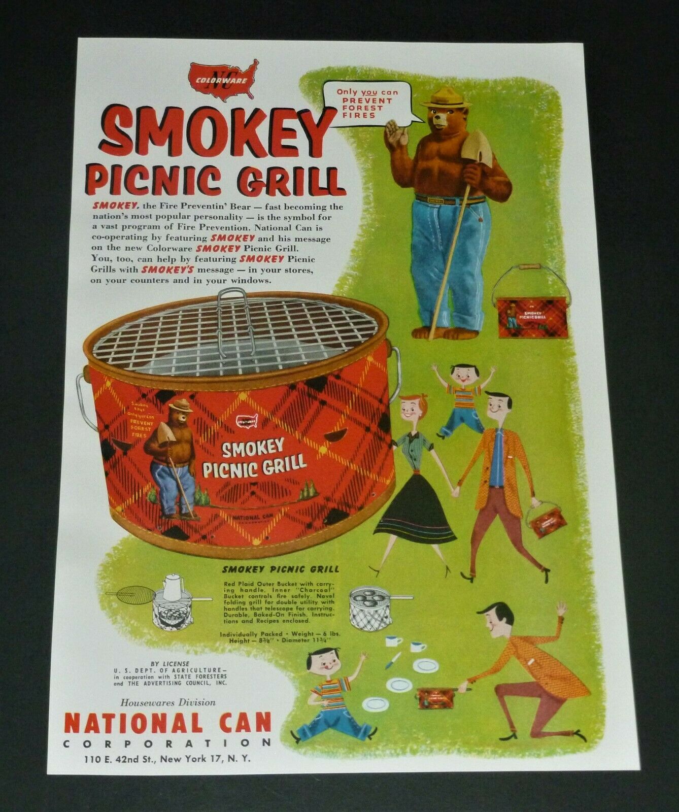 RARE Vtg 1954 SMOKEY the BEAR Picnic Grill National Can Corp. Original Print Ad