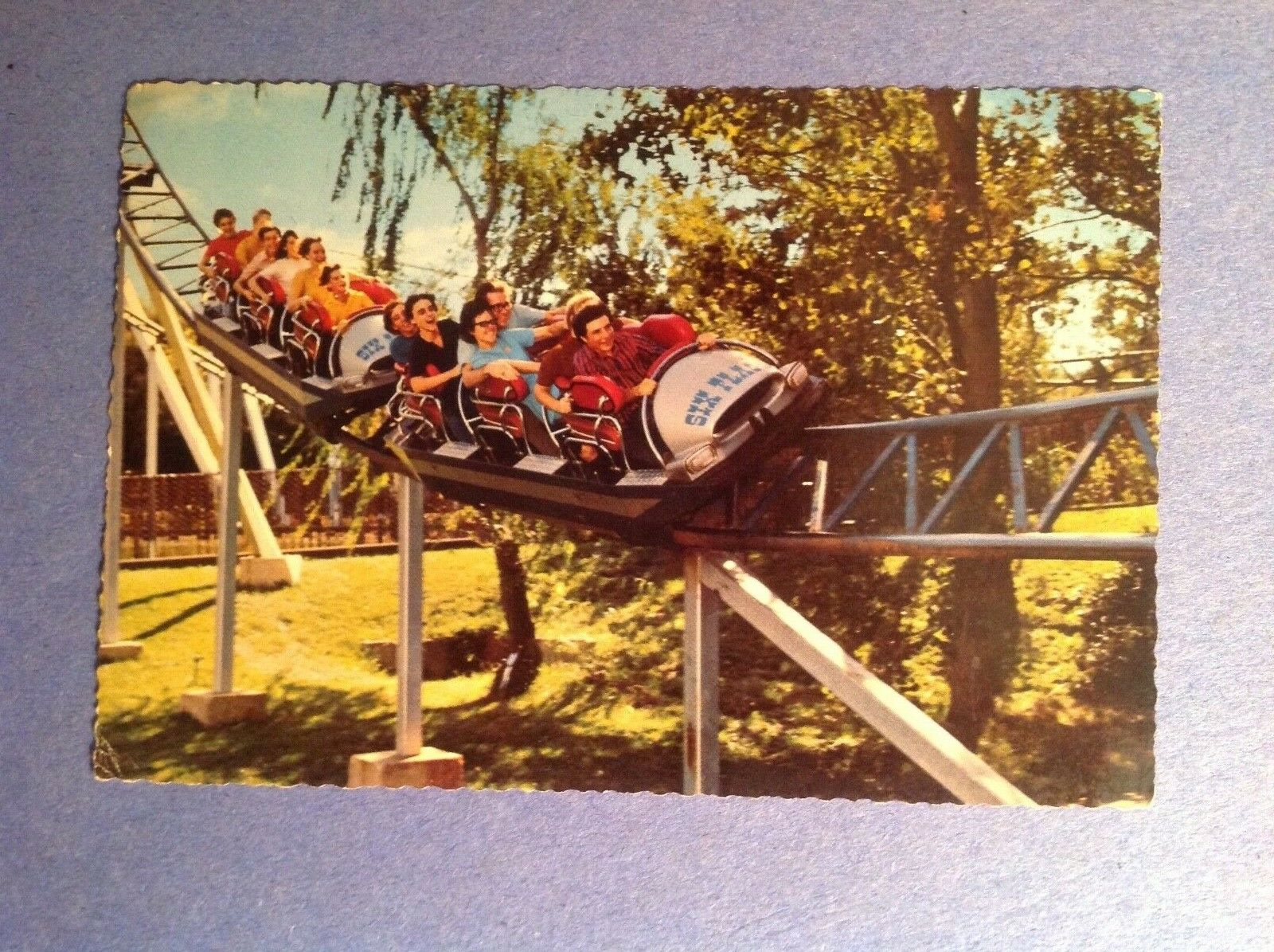 Title (ebay affiliate link): Ca ''71 6 FLAGS Over TEXAS Amusement Park View of BIG BEND Roller Coaster Riders