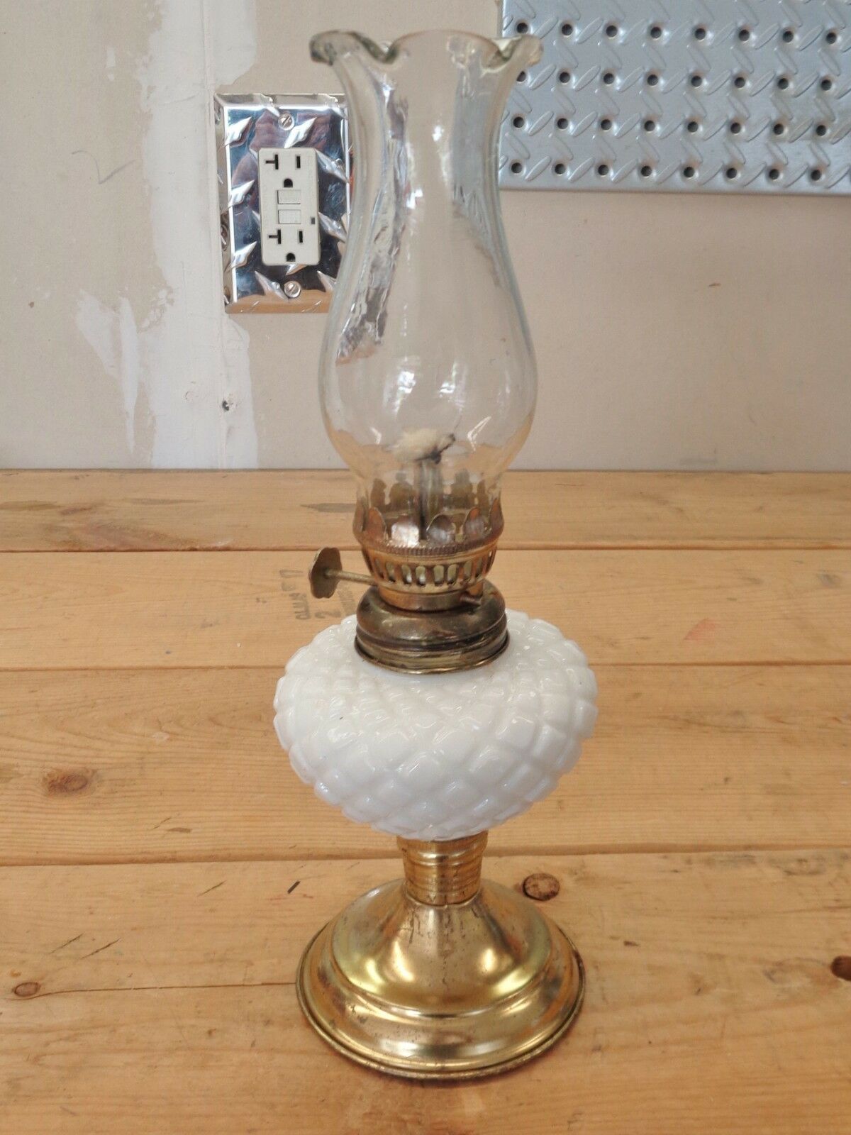 Title (ebay affiliate link): VTG MINIATURE OIL LAMP WHITE MILKGLASS HOBNAIL FONT & CHIMNEY CROWN BURNER