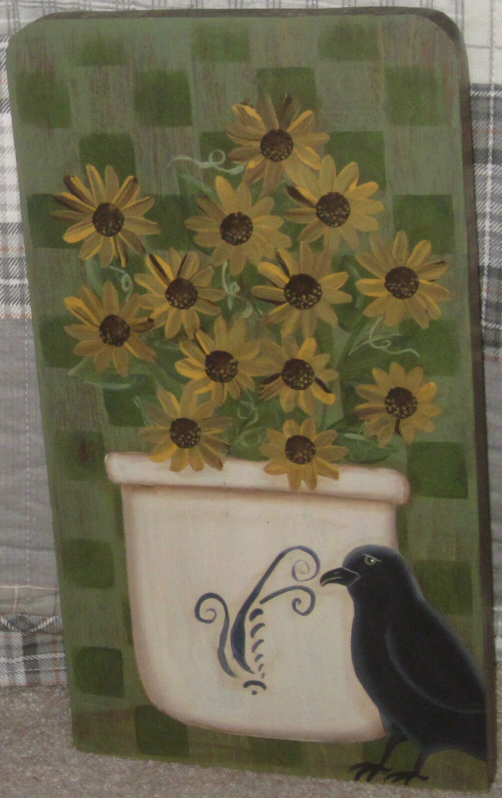 Title (ebay affiliate link): *~*PRIMITIVE*~* HP FOLK ART CROCK * SUNFLOWERS * CHECKERBOARD * RECLAIMED WOOD
