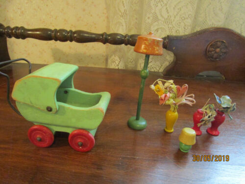 Title (ebay affiliate link): VINTAGE LOT STROMBECKER WOOD DOLL HOUSE ACCESSORIES/CARRIAGE
