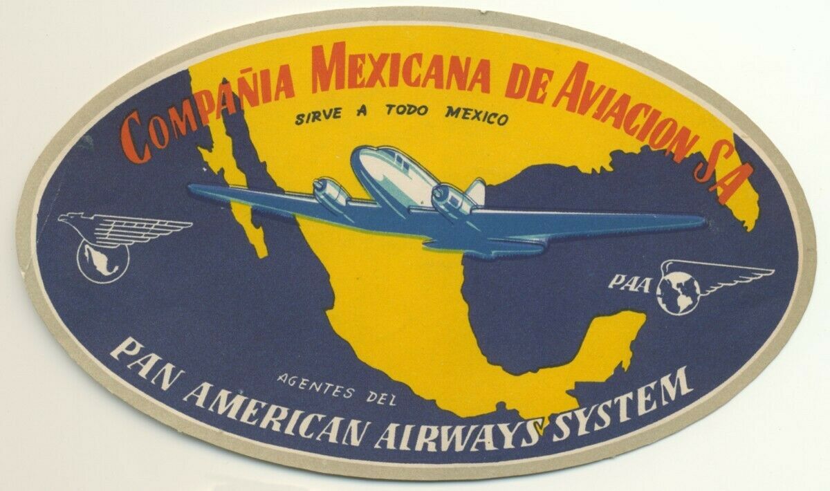 Original 1940s Airline Luggage Label MEXICANA PAN AM #1