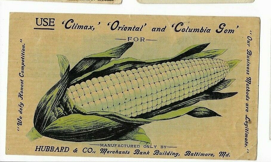 Title (ebay affiliate link): 1890''s Hubbard & Co. Climax, Oriental Corn Trade Card, Baltimore, Maryland.