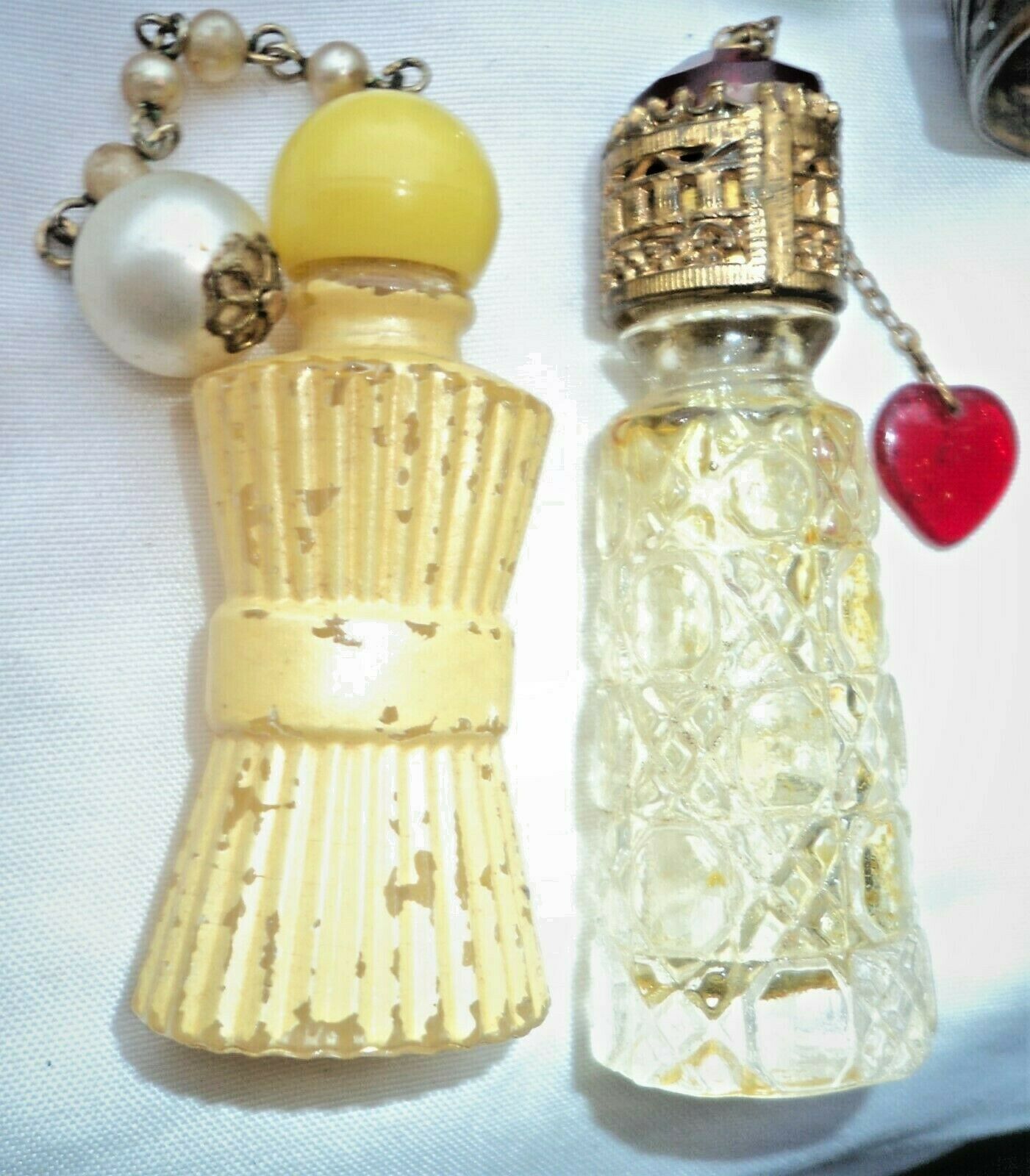 PAIR 1930S FLOWER HEART PERFUME BOTTLES DAUBERS YELLOW RED