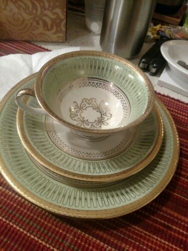 Bavaria Germany Tea Cup Saucer Plate Luncheon Set Zeh Scherzer light olive White