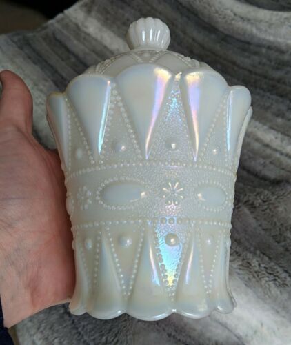 Title (ebay affiliate link): Phoenix LACY DEWDROP Pearlized Milk Glass COVERED SUGAR Bowl. RARE!