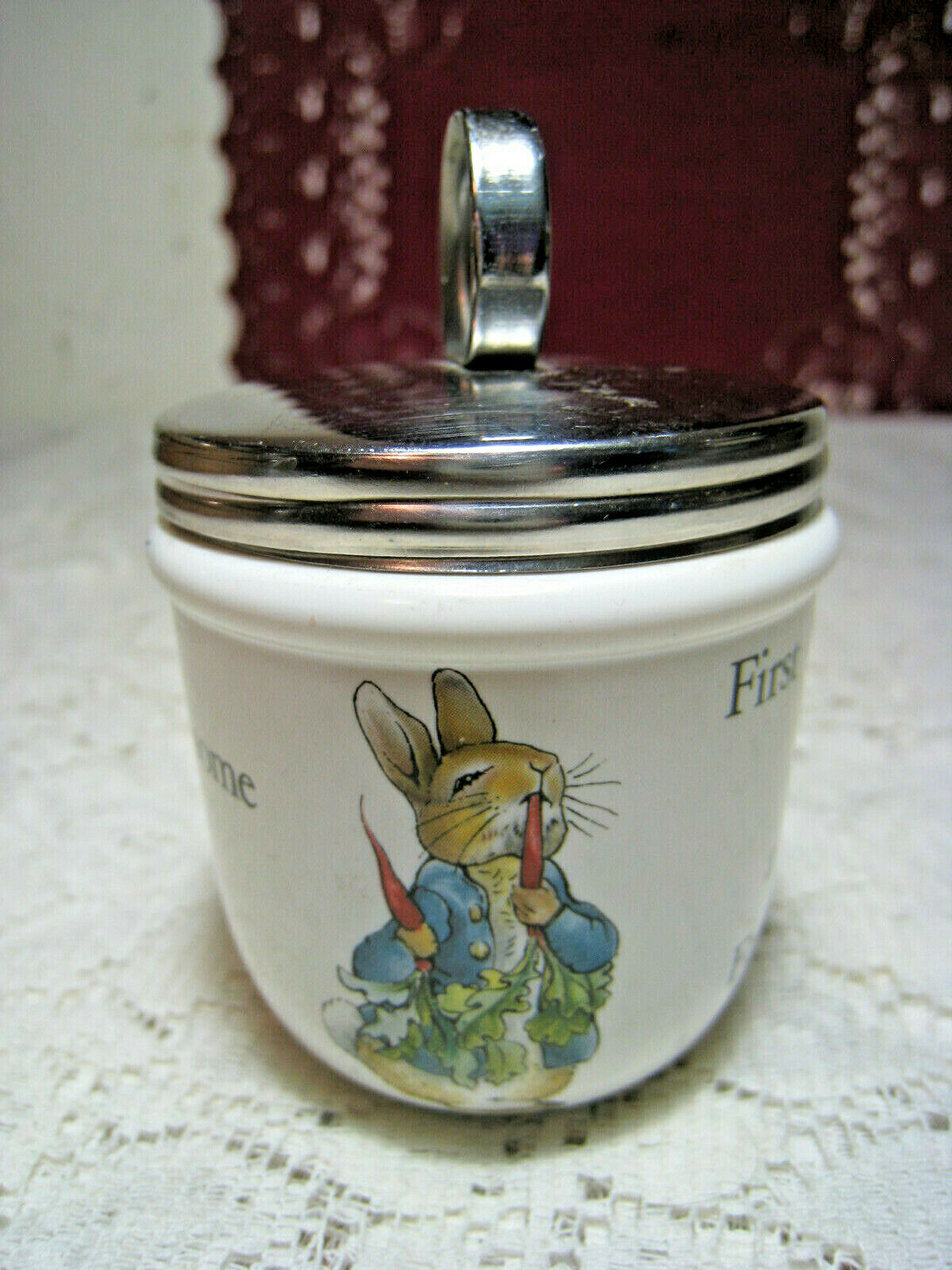 Title (ebay affiliate link): Vintage Wedgwood Peter Rabbit Beatrix Potter Egg Coddler Milk Glass Metal Lid