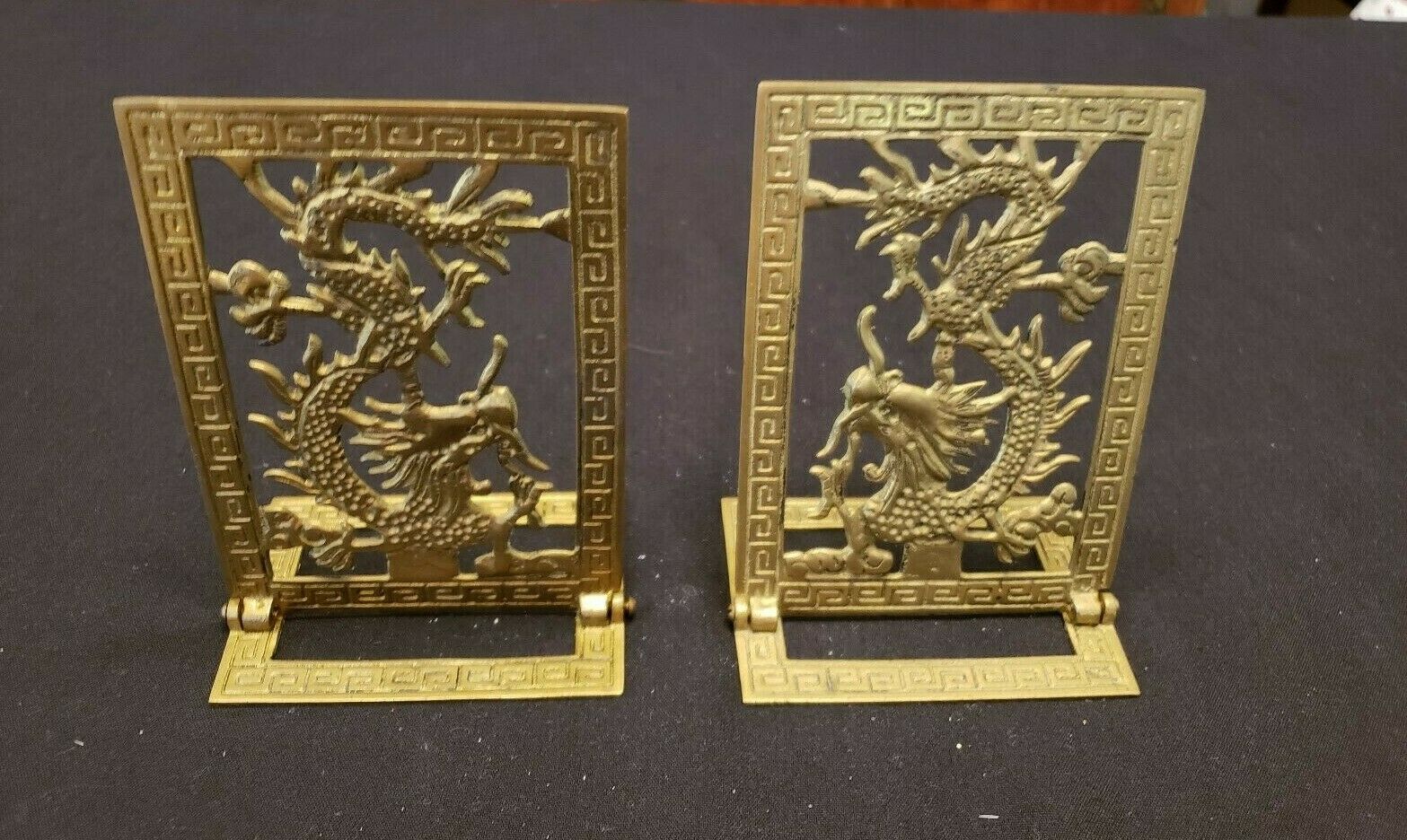 PAIR OF ANTIQUE/VINTAGE ORIENTIAL ASIAN BRASS FOLDING BOOKENDS~DRAGONS 4 X 5 3/4