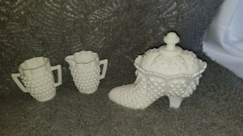 Fenton Art Milk Glass Hobnail SHOE CANDY DISH With Lid + Sm Creamer and Sugar
