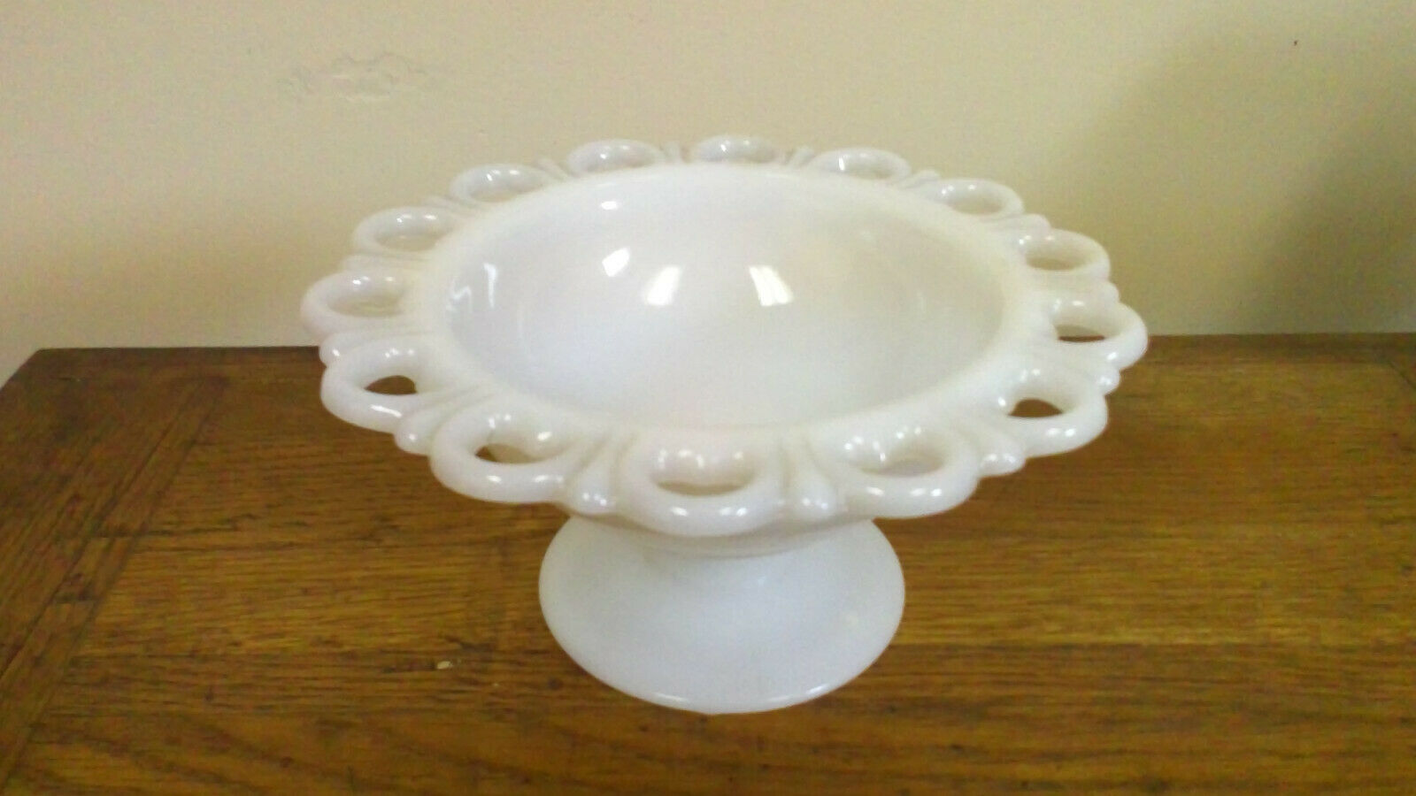 Title (ebay affiliate link): Vintage White Milk Glass Lace Edge Pedestal Footed Candy Dish Compote Bowl