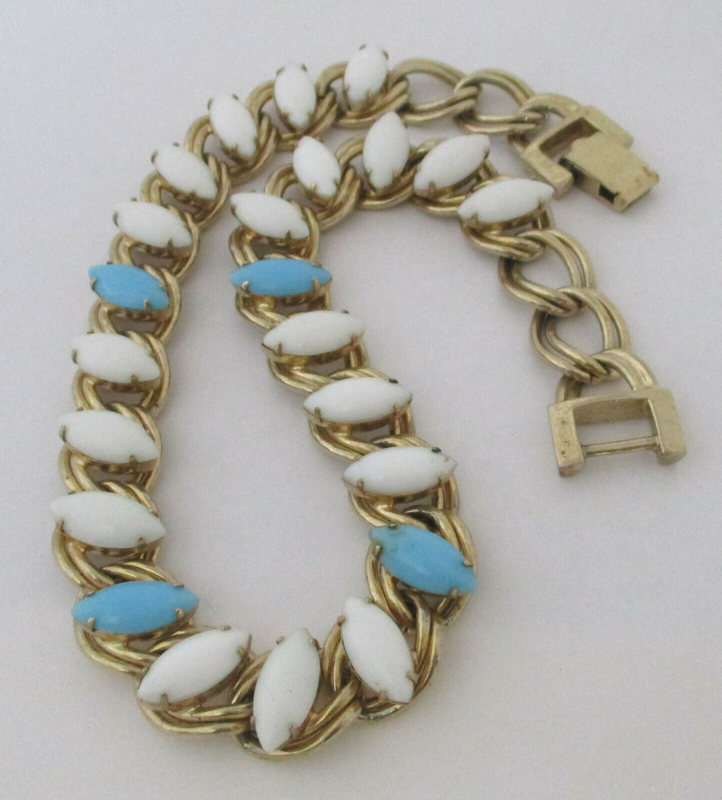 Title (ebay affiliate link): Vintage White/Turquoise-Blue Milk Glass Cabochon Necklace Kafin