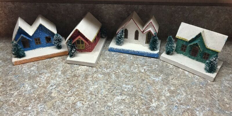 Title (ebay affiliate link): 4 CHRISTMAS JAPAN CARDBOARD PUTZ HOUSES Village Church Mica Bottle Brush Trees