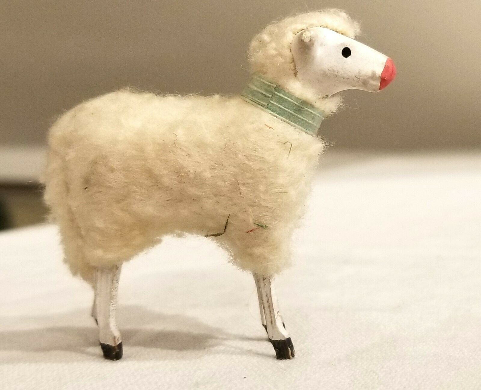 1st Miniature Wooly Sheep. Wooden Legs, Wool-wrapped Body. Blue Collar German