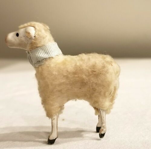 Title (ebay affiliate link): 7th Miniature Wooly Sheep. Wooden Legs, Wool-wrapped Body. Blue Collar German