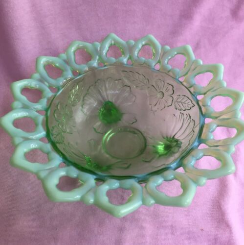 Title (ebay affiliate link): SMALL GREEN DEPRESSION STYLE CANDY DISH WITH LACED EDGE