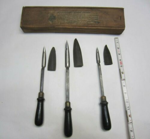 ANTIQUE TOOL VLCHEK FOUR SIDED BEARING SCRAPERS SET OF 3 IN ORIGINAL WOODEN BOX