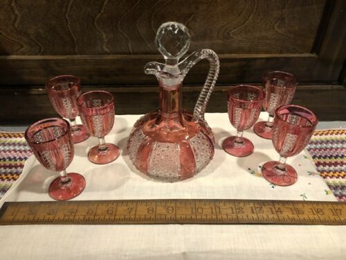 Cranberry Glass Vintage Decanter And Glasses, Drinking Set