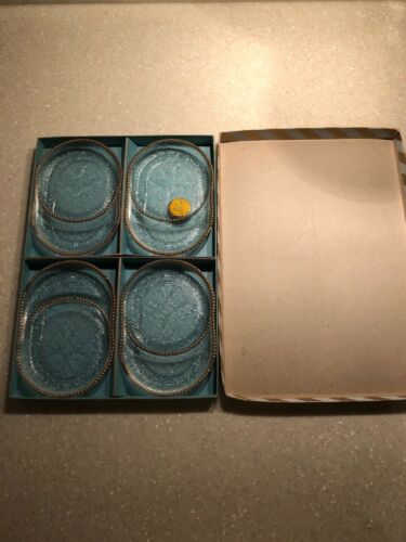 4PC Boxed Depression Glass Coaster/Ashtray Harp Pattern 22KT Gold Trim Labeled