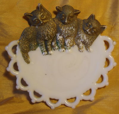 Vtg Milk Glass Plate w Gold Figurals: 3 Kittens / Cats