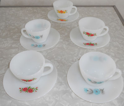 5 OLD STOCK FIRE KING MILK GLASS FLORAL CUPS & SAUCERS