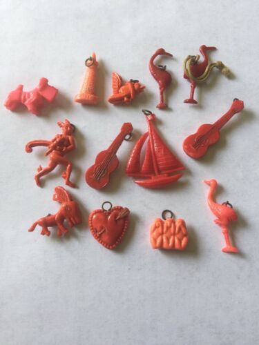 Title (ebay affiliate link): 13-Lot 1940-1960 Vintage Cracker Jack Red Celluloid Plastic Toy Prize Charms