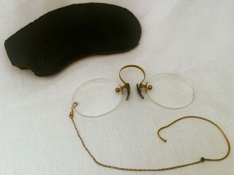 Title (ebay affiliate link): ANTIQUE Gold Tone PINCE Nez SPECTACLES w/ EAR WIRE Chain and Slide Case