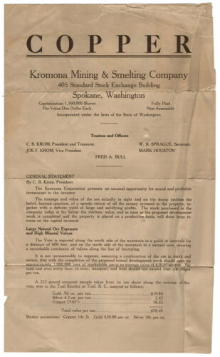 Title (ebay affiliate link): Old Kromona Mining & Smelting COPPER Prospectus SULTAN DISTRICT MAP Spokane WA