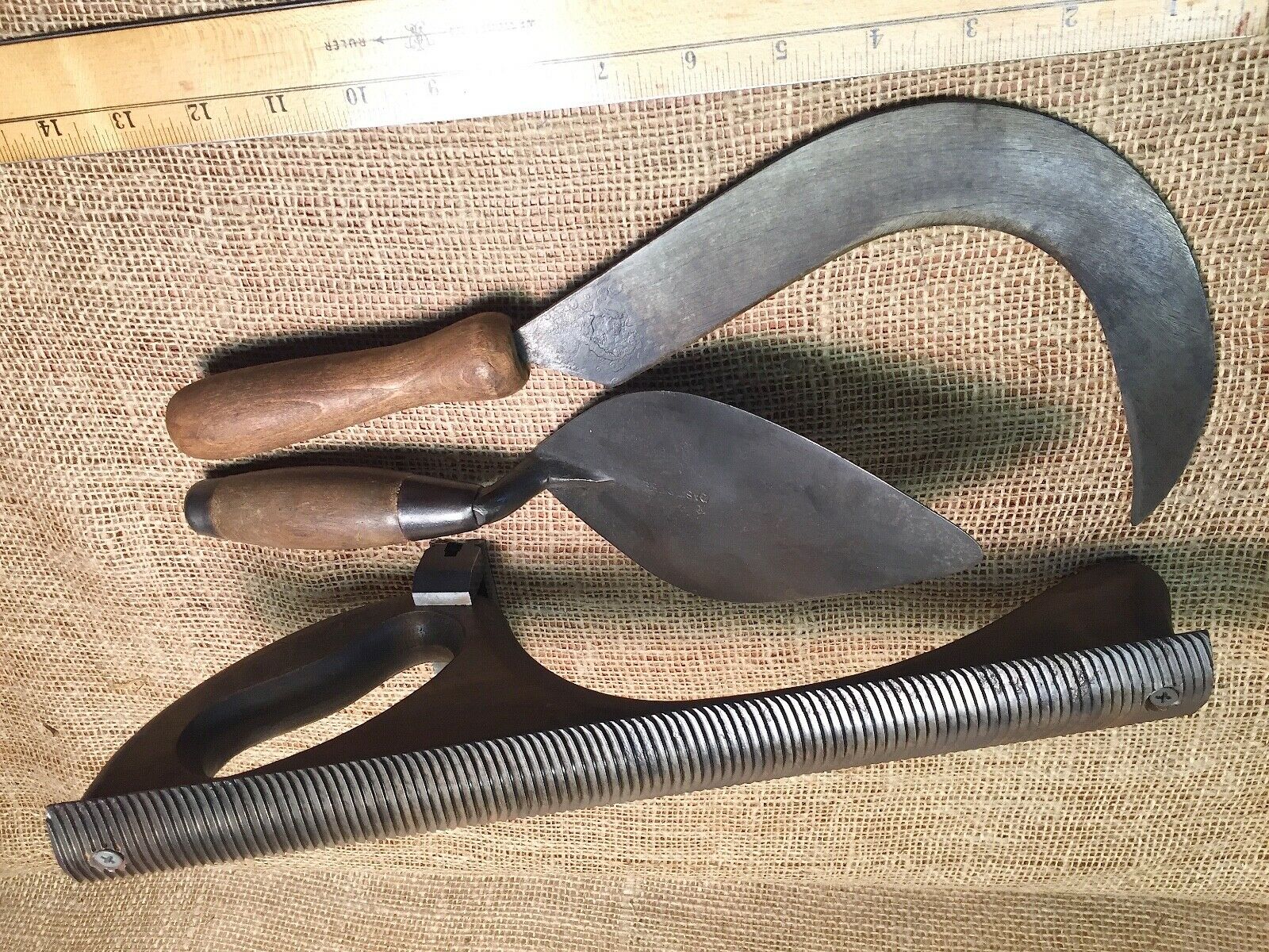 Title (ebay affiliate link): 3 EST. ANTIQUE WOOD-HANDLED HAND TOOLS -TROWEL- HOOKED CUTTER - CONTOURED RASP