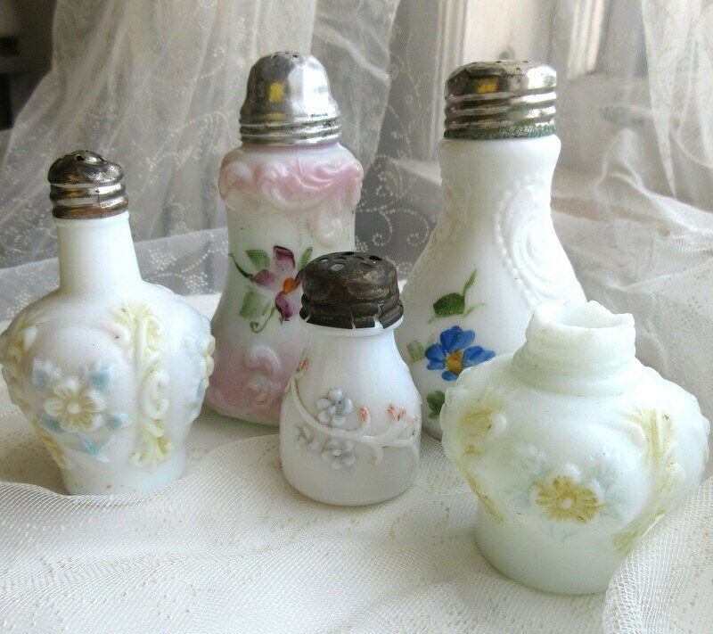 Title (ebay affiliate link): 5Pc Antique PAINTED WHITE MILK GLASS SINGLE SALT SHAKER LOT Stick Pin Holder
