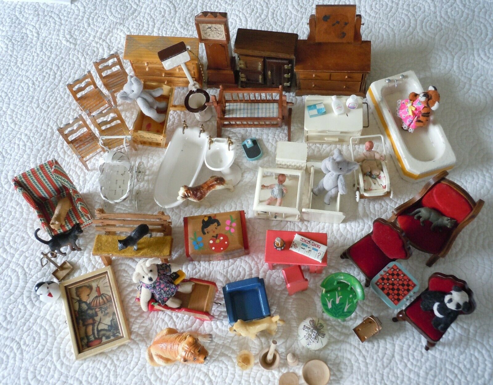 Title (ebay affiliate link): Lot Of Vtg Miniature Dollhouse Furniture & Accessories 1:12 & 2 Caco Baby Dolls