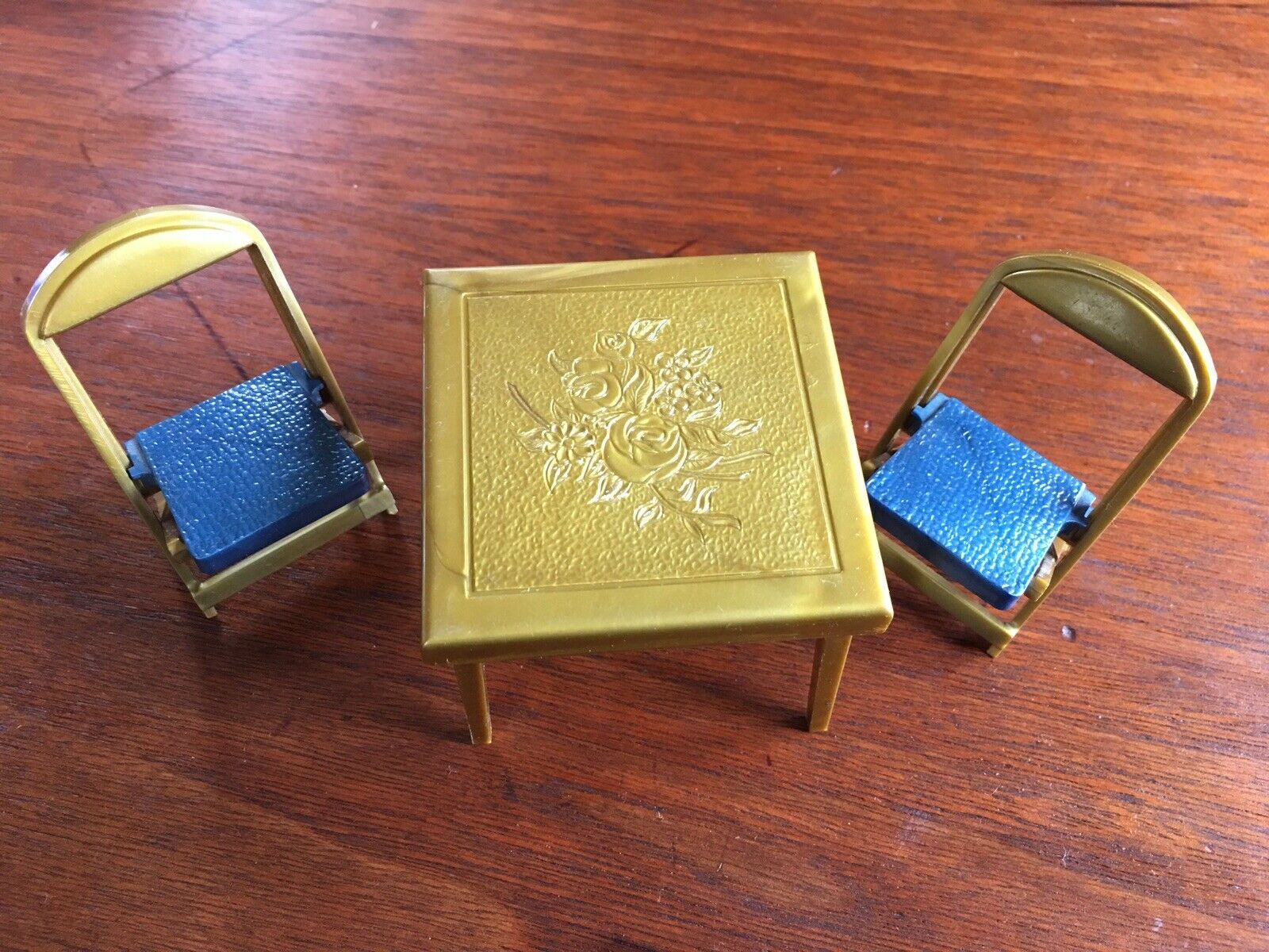 Title (ebay affiliate link): Vintage Dollhouse Furniture Renwal Folding Table & 2 Chairs Gold Blue Rare Card