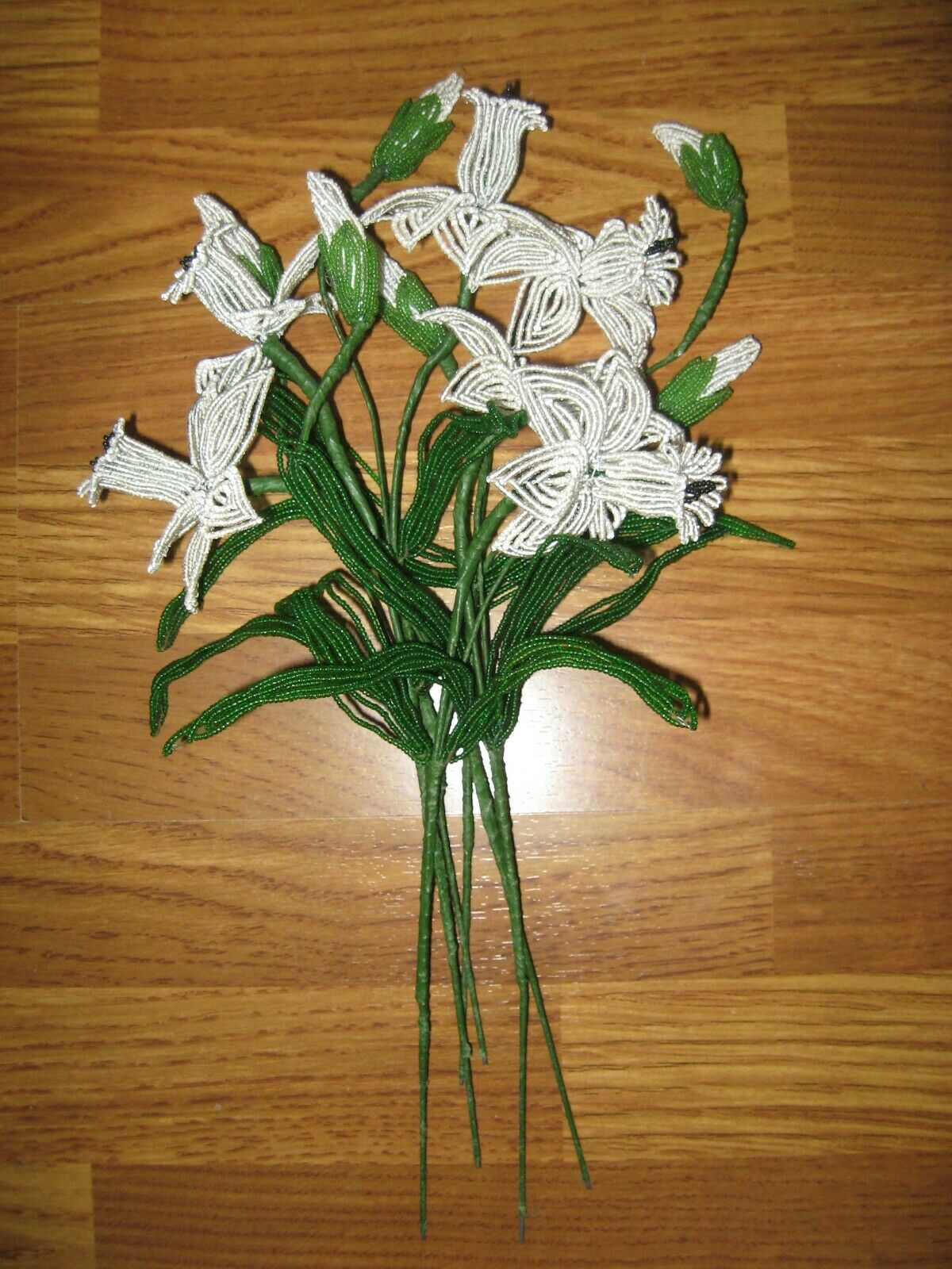 Vintage French Glass Seed Bead White Flowers Buds 6 Stems