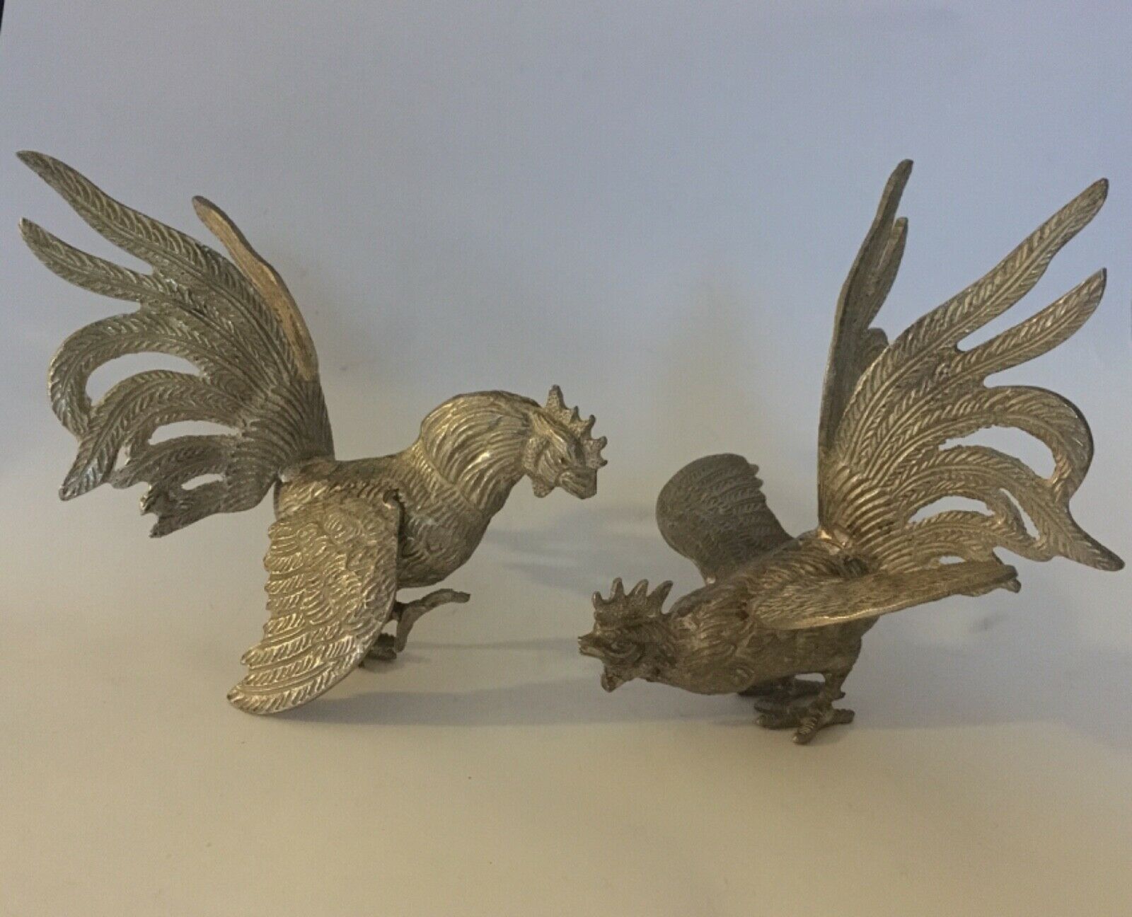 2 vintage Brass fighting Roosters italy pair Cocks Ital silver tone #eBayMarket
