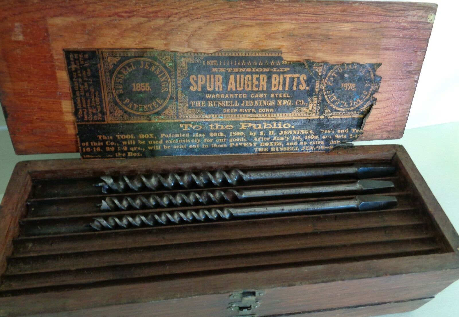 Old Russell Jennings Spur Auger Bitts in Original Wooden Box Drills Tools