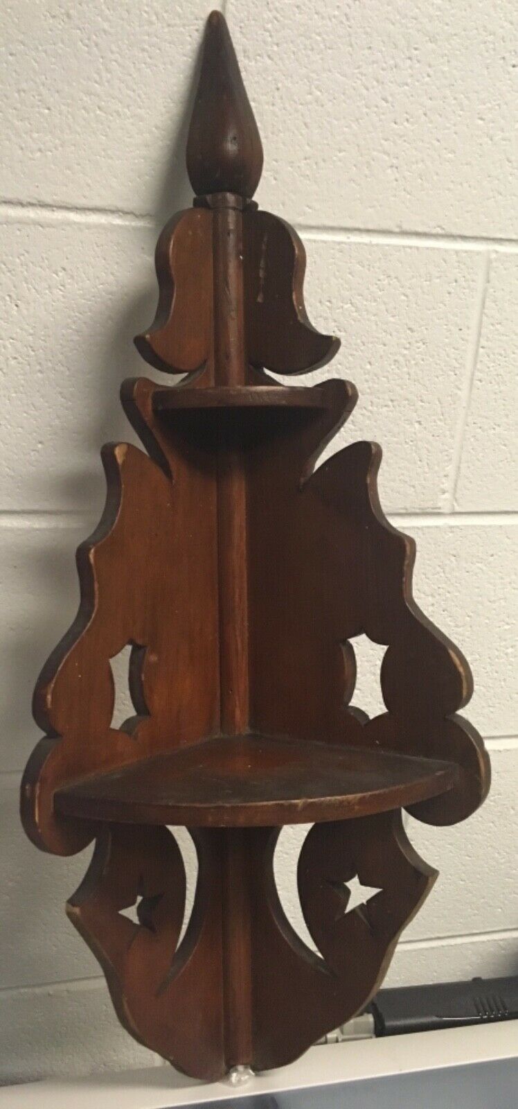 Title (ebay affiliate link): Old AAFA Folk Art Carved and Grain Painted Wood Flame Finial Corner Wall Shelf