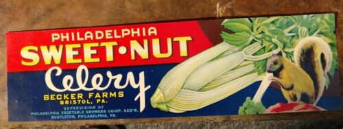 Title (ebay affiliate link): PHILADELPHIA SWEET-NUT CELERY CRATE LABEL File Copy 1930s Bristol PA squirrel