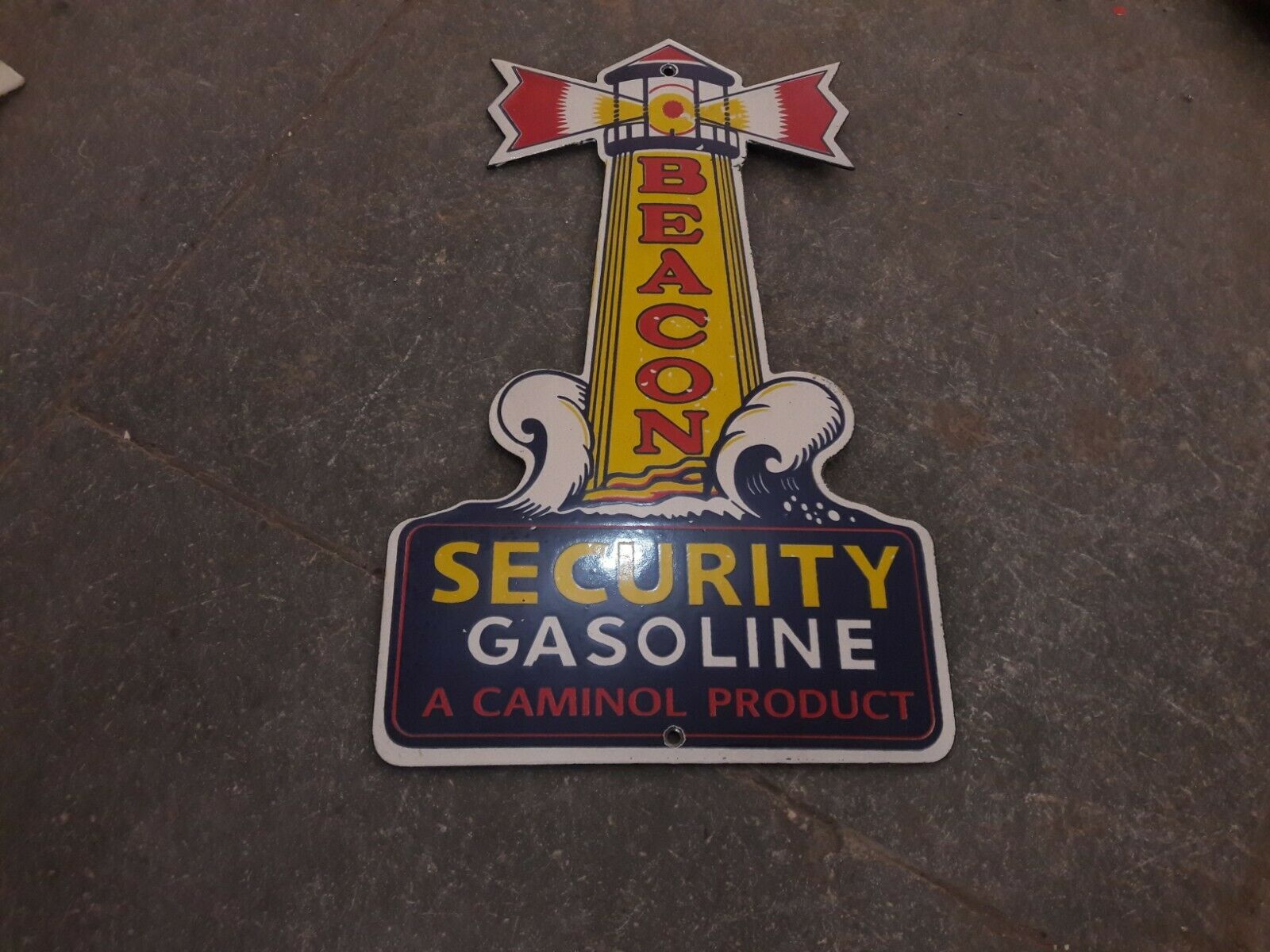 Porcelain Beacon Security Gasoline Enamel Sign SIZE 12" X 8.5" Inches