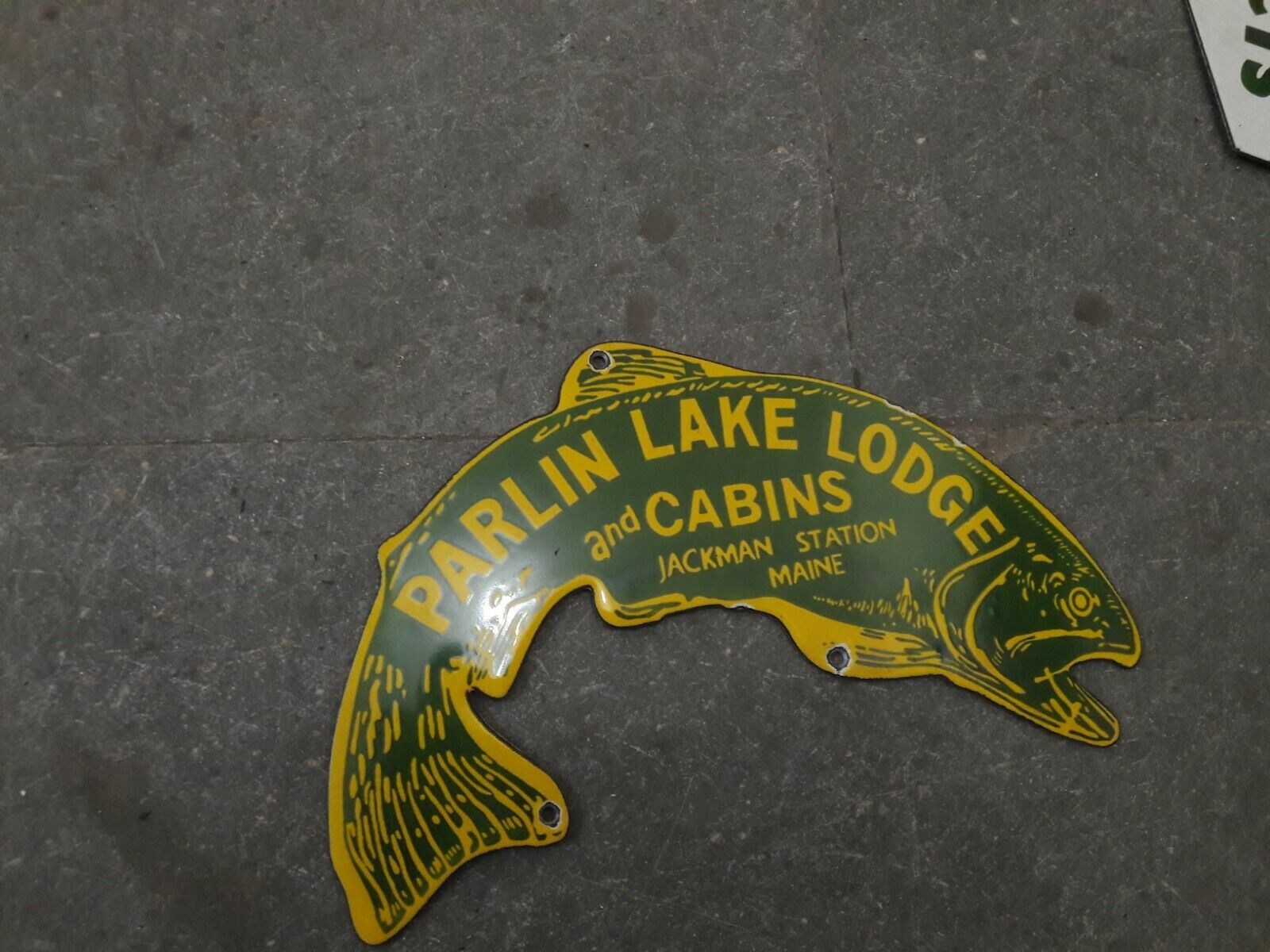 Porcelain Parlin Lake Lodge Enamel Sign Size 10" x 3.5" Inches