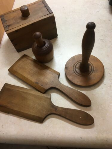 Title (ebay affiliate link): 5 Vintage Primitive Wood Butter Molds Paddles- Great Patina!