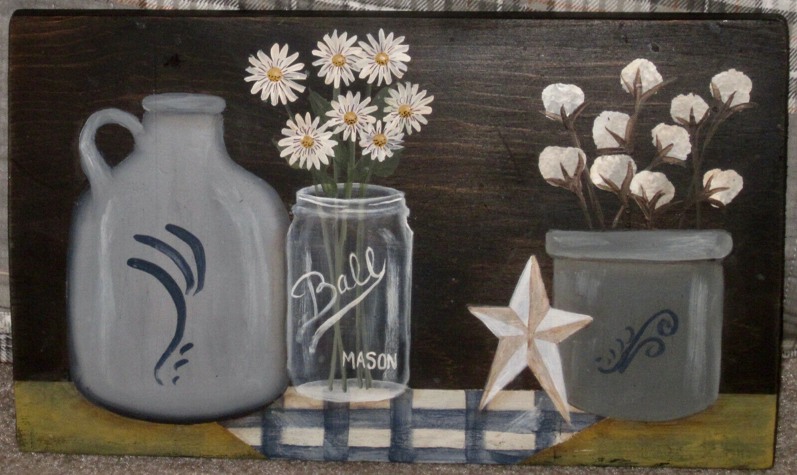 Title (ebay affiliate link): *~*PRIMITIVE*~* HP FOLK ART CROCKS * BALL JAR * DAISIES * STAR * COTTON * BOARD