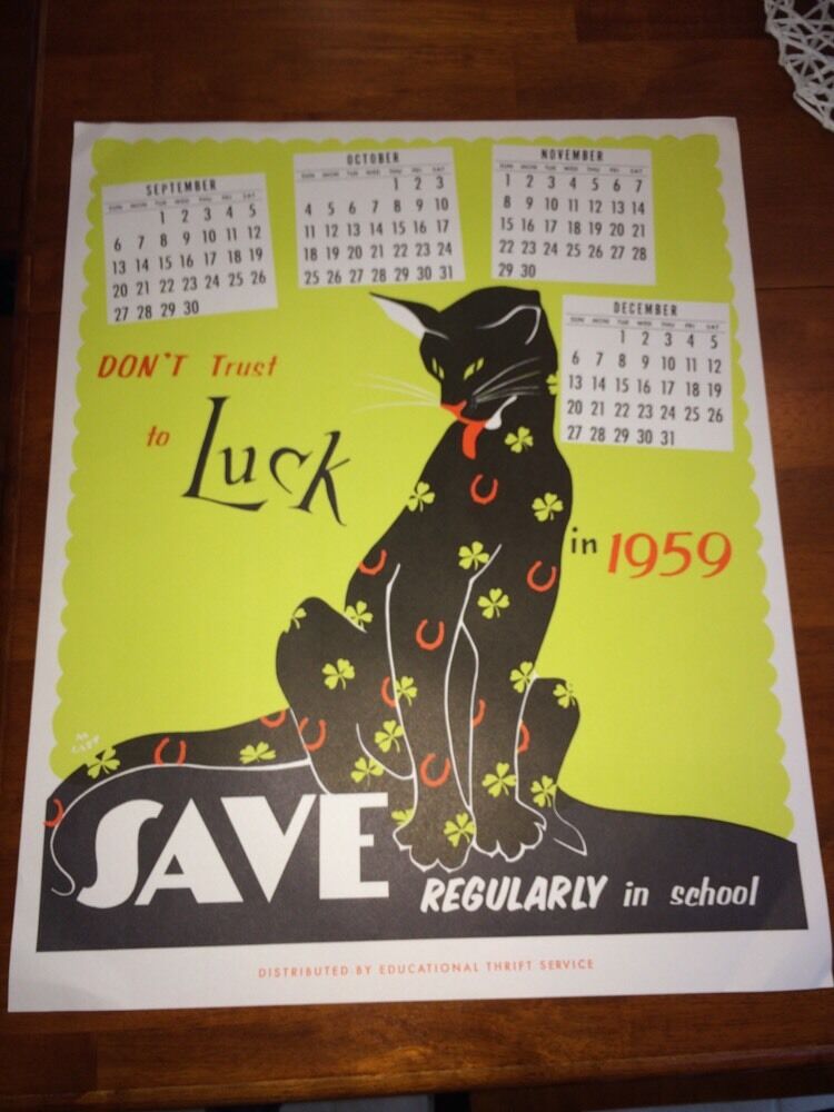 Title (ebay affiliate link): Black Cat Save Regularly School Education Bank 1959 Calendar sign 20X17