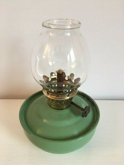 Title (ebay affiliate link): Vintage green enamel + brass Kelly/ Nursery Oil Lamp - weighted base/clear shade