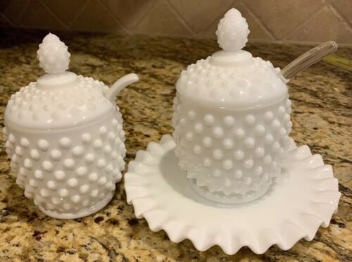Title (ebay affiliate link): Fenton Hobnail White Milkglass Jam Set & Jam Jar With Spoons # 3903 (1952-73)