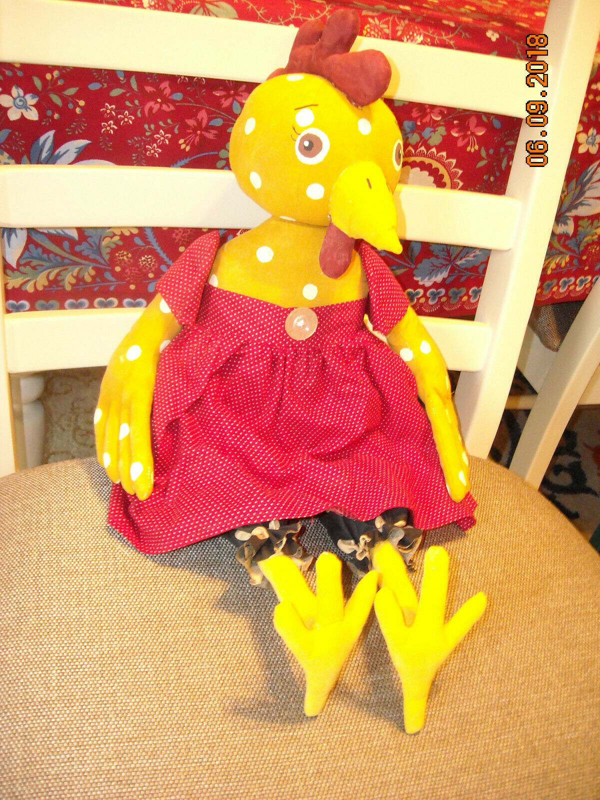 Title (ebay affiliate link): Primitive Folk Art Farmhouse Chicken Doll Shelf Sitter Red and Blue outfit