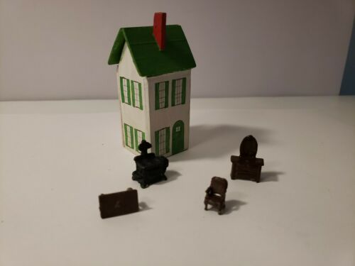 Title (ebay affiliate link): MINIATURE VINTAGE SIGNED HAND MADE TINY DOLLHOUSE WITH PAINTED METAL FURNITURE