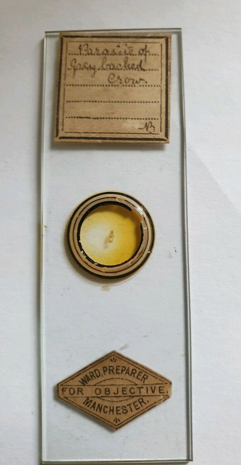 Title (ebay affiliate link): VERY FINE ANTIQUE MICROSCOPE SLIDE "PARASITE OF GREY BACKED CROW" BY E. WARD